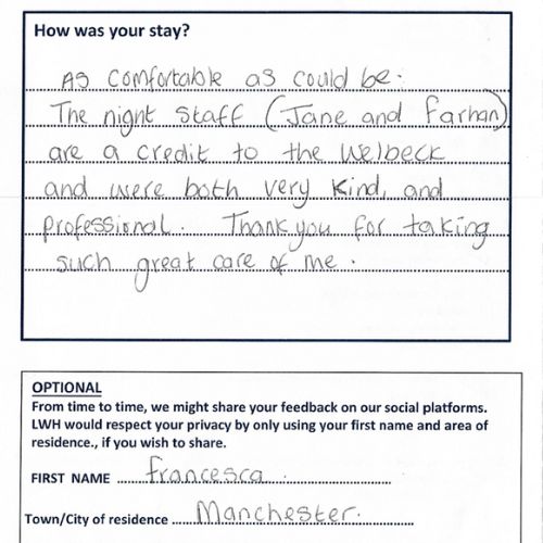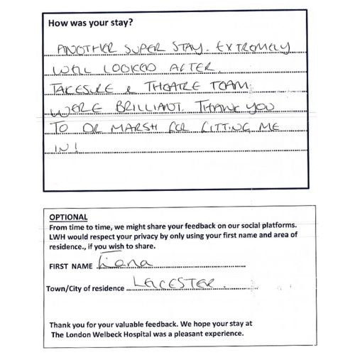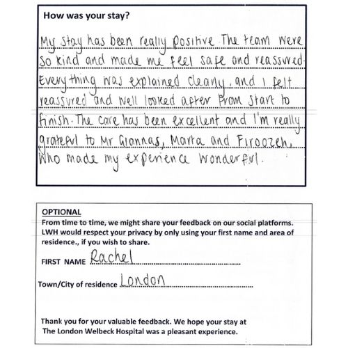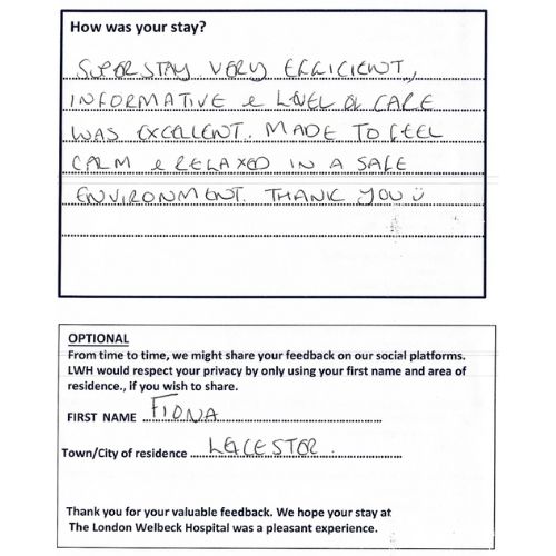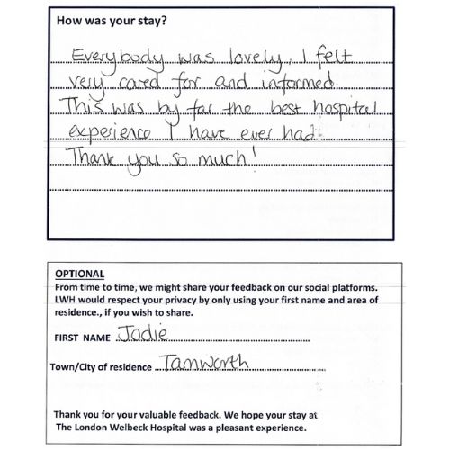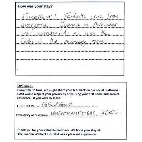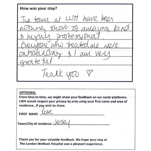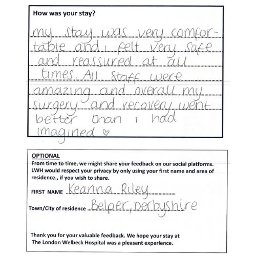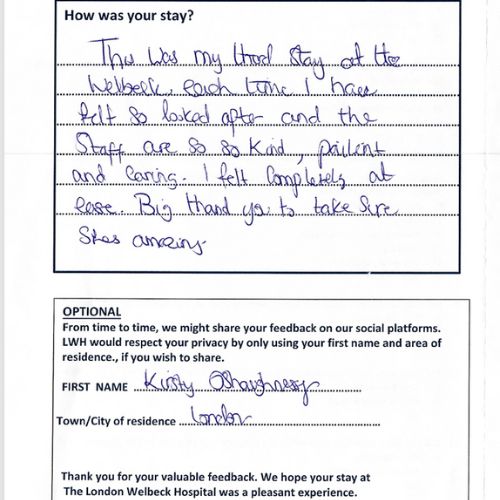 EXCELLENT Based on 59 reviews Jacqui Arbery2025-07-21Trustindex verifies that the original source of the review is Google. We had an appointment here today. Very pleasant staff to direct you to the right area. Comfortable waiting area with complimentary drinks. We were seen very promptly by Delorus. She explained thoroughly the procedure and was very kind throughout Very impressive zunaira Mahum2025-06-13Trustindex verifies that the original source of the review is Google. I had cosmetic surgery at The Welbeck Hospital and was extremely pleased with the experience. From the initial consultation to post-operative follow-ups, the team's care and professionalism were outstanding. The surgeon was confident and thorough in explaining the procedure, and the staff on surgery day were warm and calming. The facilities were clean and modern, contributing to a positive experience. Special thanks to Dr. George and Nurse Joanna! Adey Ward2025-05-25Trustindex verifies that the original source of the review is Google. Had surgery yesterday with Dr Giannas which was great from start to finish. Dr Giannas is a very knowledgeable man and he knows what he’s doing. I have 100% trust in him. Helen my nurse for the day was absolutely wonderful, she made me feel at ease for the whole day and nothing was too much for her. She went above and beyond and then back again! Thank you for a very nice experience Helen, you’re an asset to Welbeck ☺️ Madeline Gandy2025-03-28Trustindex verifies that the original source of the review is Google. Stayed here today, I've been to two of myas hospital i got put in and this one is by far the best one, better rooms own toilet in the room able to watch tv husband got to stay in the room and come back and waited for me when i come out of the surgery all the nurses was kind and the night nurse who was still there in the morning. The lady who was helping me once I woke up was really polite and friendly and then when i was taken back to my room all the other nurses was kind friendly and helpful. My dr was dr mileto i had a little wait when I arrived as I was the 2nd person to be seen but other then that he kept me up todate and let me talk about what his doing and making sure its all sorted so now is the waiting time for me to know if my revision is corrected but I've heard great things with this dr so I'm praying for the best. And will update my post when I'm healed! I also had anesthesiologist who has put me to sleep twice now ,I've forgotten his name but he is such a down to earth bubbly man who put my mind at rest and explains everything so well to me. There also was an older man who was trying to ease my mind before being put to sleep and he was amazing too. I felt very welcomed here. Highly recommend this hospital:) M Sky2025-03-07Trustindex verifies that the original source of the review is Google. Excellent experience. Really recommend li Ly2025-01-23Trustindex verifies that the original source of the review is Google. I had the best treatment at the Welbeck hospital. From the doctors to nurses and receptionist are the nicest people all were incredibly kind and proffesional. I cannot thank you enough. I had a big surgery and it felt easy because of you. Checking up on me in middle of the night and treating me with best equipment. You are The Best. Thank you so so much 🙏🙏🙏 xoxo N B2025-01-10Trustindex verifies that the original source of the review is Google. Thank you to Helen and the staff at the Welbeck for a smooth and positive experience with my procedure last week! Natasha Smile2025-01-08Trustindex verifies that the original source of the review is Google. Amazing experience from start to finish. Nurse Helen Collard & Nurse Jane were absolutely incredible - I feel very lucky to have had the dream team looking after my every need. Every nurse, night porter, my anaesthetist ( sorry i cant remember all their names as it is a big team) made me feel very at ease and comfortable throughout the whole day. Dr Marcellino is a wonderful calm & talented surgeon who i am lucky to have had my 2nd procedure with. I couldn't recommend highly enough and feel extremely blessed. Donna J2024-12-17Trustindex verifies that the original source of the review is Google. I had the pleasure of being a day case at the London Wellbeck Hospital last week. Such wonderful care, I did not want to leave! My welcome from the morning receptionist was lovely, we chatted and discussed skincare, she put me at ease straight away. My room was warm, clean and comfortable, the staff were kind and kept me informed of updates regularly. The environment was very calming and I felt relaxed going into my surgery. Thank you to the anaesthetist and my surgeon Mr Mileto who were simply amazing, thorough, considerate, gentle and respectful - talking me through each stage of the day. I felt completely at ease. To my wonderful nurse Marta who was exceptional, all day, there was nothing she didn’t think of…. Absolute sweetheart, we talked and laughed… what a credit to the hospital! Also to the young man in the evening (sorry I didn’t catch your name) who brought coffee exactly when it was needed and helped me with my bags… Thank you to you all…!